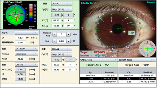 角膜前面形状に加えて角膜後面形状も実測値を使った角膜全体乱視度数から患者さんに適したトーリック眼内レンズの円柱度数情報を提供します。